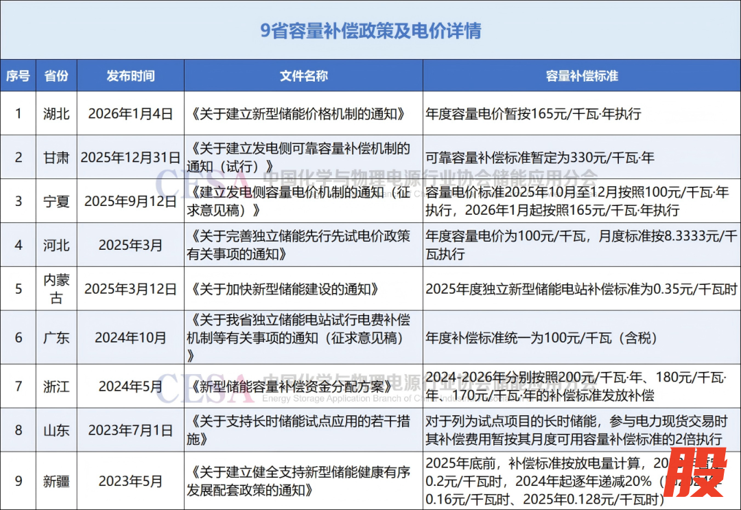 当前,我国正处于从各地探索“容量补偿”向全国范围建立统一、规范的“容量电价”机制过渡的关键阶段。截至目前,全国已经有包括湖北、甘肃、宁夏等9省公布了电网侧独立储能容量补偿政策及价格标准。