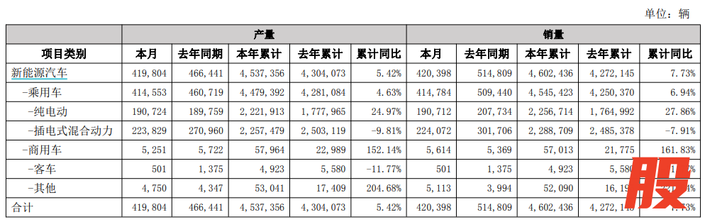 其中,乘用车销量为454.5万辆,同比增长6.94%,商用车销量为57,013辆,同比增长161.83%。纯电动车型累计销量达225.67万辆,同比增长27.86%;插电式混合动力车型累计销量为229万辆,同比下降7.91%。