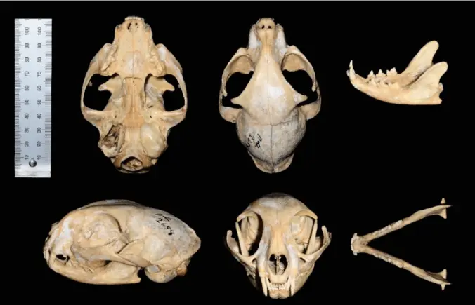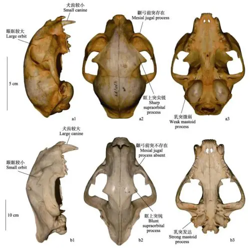 猫族和豹族的骨骼解剖学特征差异:猫族动物有相对大的眼眶,而且具有颧弓前突,头骨眼眶上面还有尖锐的眶上突。而豹族动物眼眶小一些,没有颧弓前突,头骨眼眶上的眶上突比较钝。
