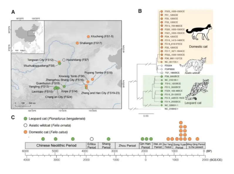 到这里有人可能会问,它们有没有和中国现在养的家猫有混血,或者成为中国最早的家猫呢?答案是否定的。毕竟它们的考古样本实在太少了,也没多少明确的被当作宠物饲养的证明,而基于线粒体和Y染色体的相关数据,所有的家猫是起源于非洲的亚非野猫,“在亚洲和非洲,都有亚非野猫被驯化”的说法站不住脚。