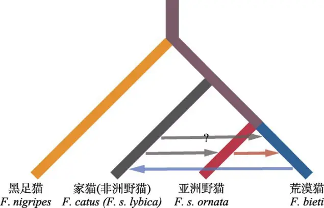 野猫类群和家猫系统发生关系和基因流信号示意图