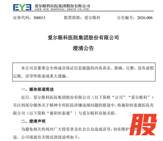 爱尔眼科随后发布澄清公告,公告称,近日,爱尔眼科医院集团股份有限公司(以下简称“公司”“爱尔眼科”)关注到部分媒体关于精神专科医院涉嫌违规问题的报道中,将襄阳恒泰康医院有限公司(以下简称“襄阳恒泰康”)与爱尔眼科直接关联。